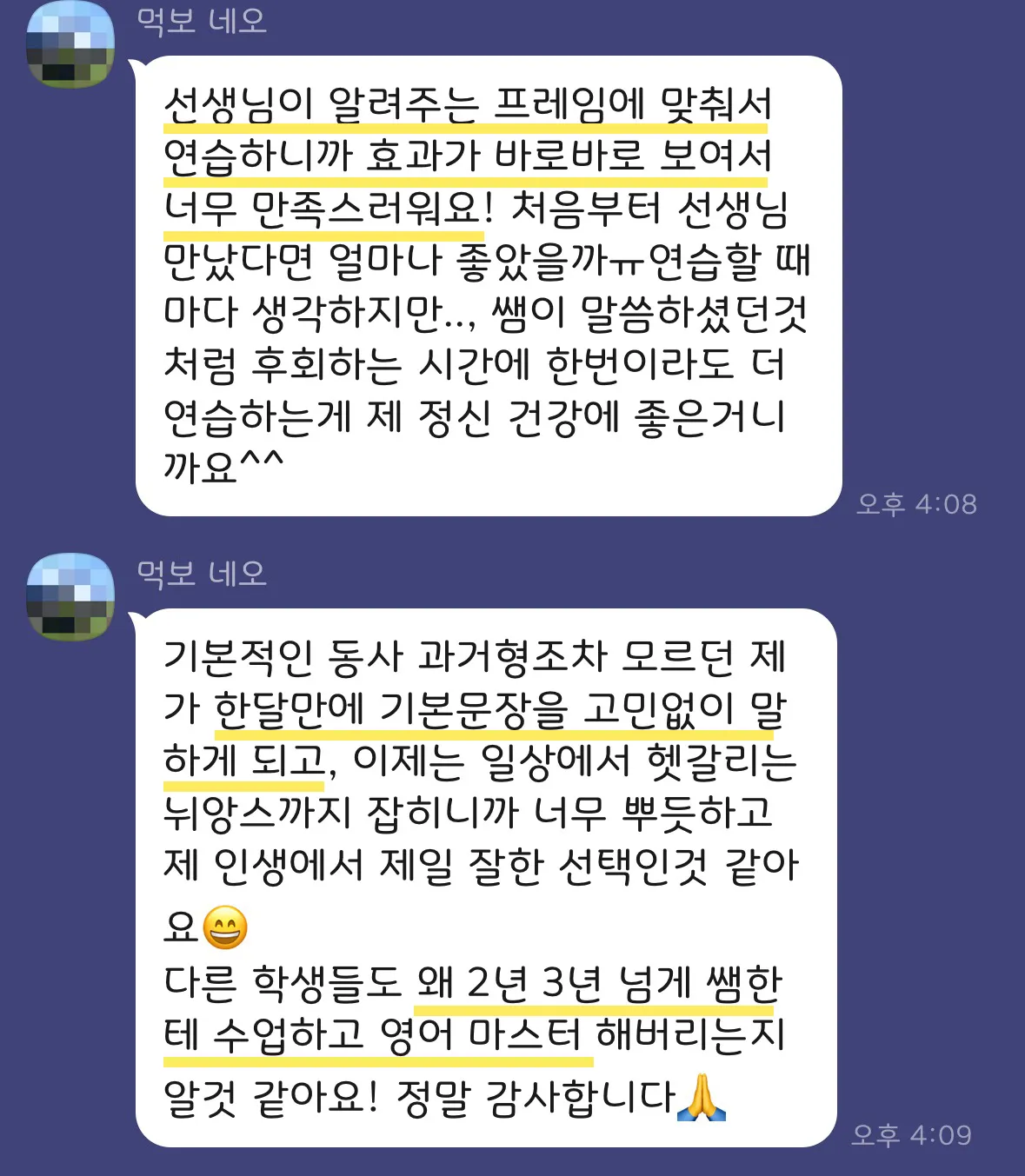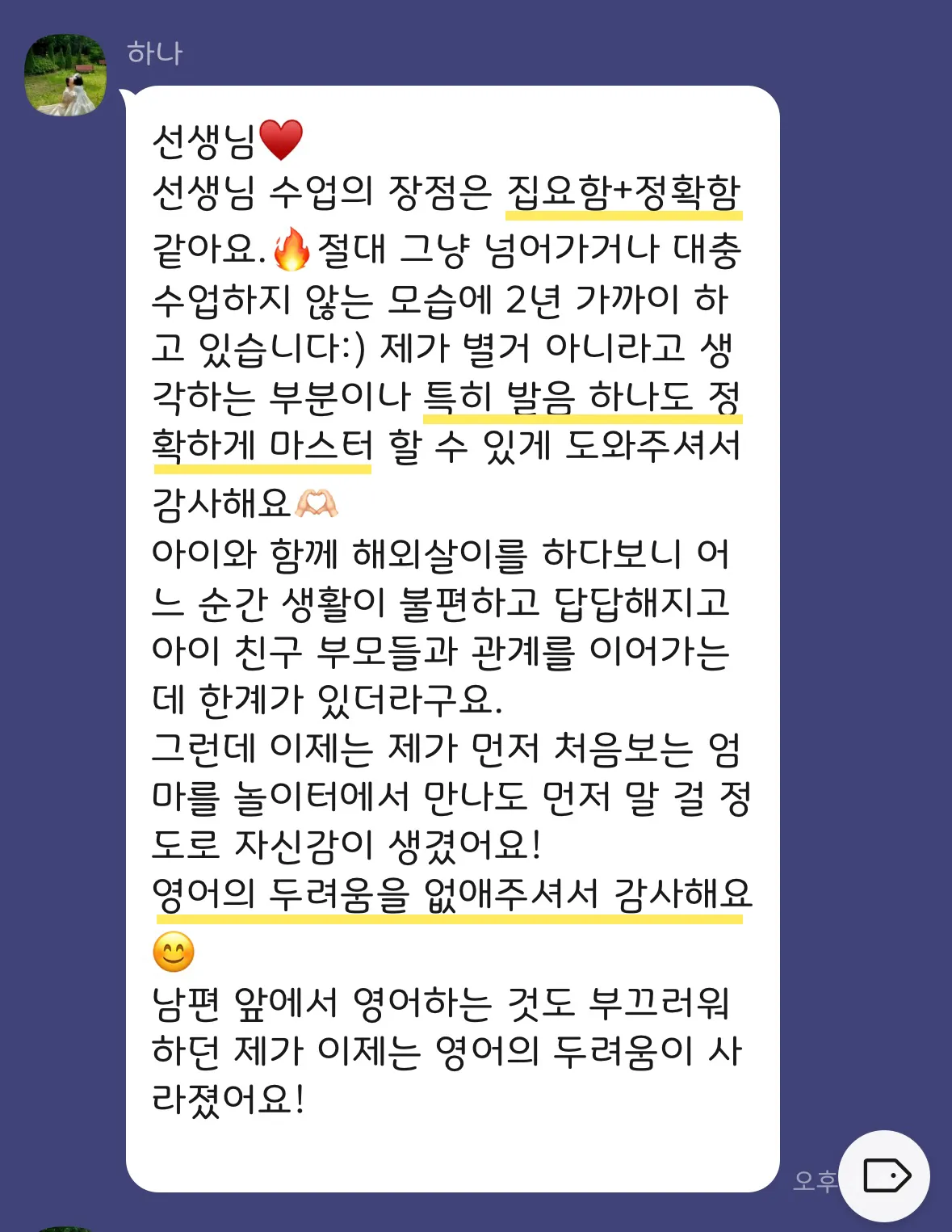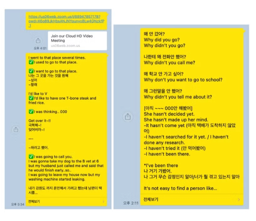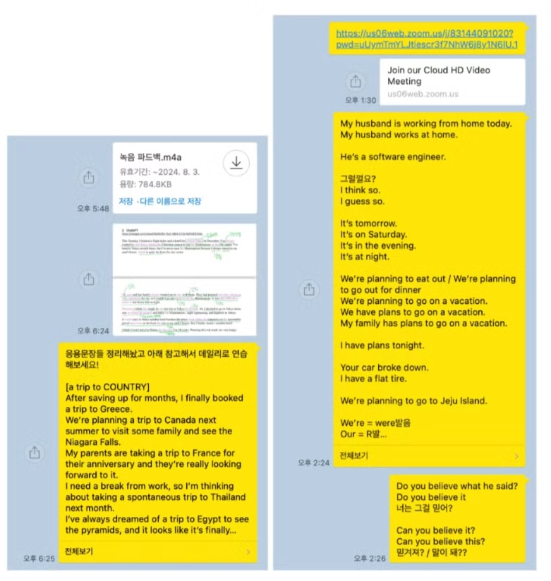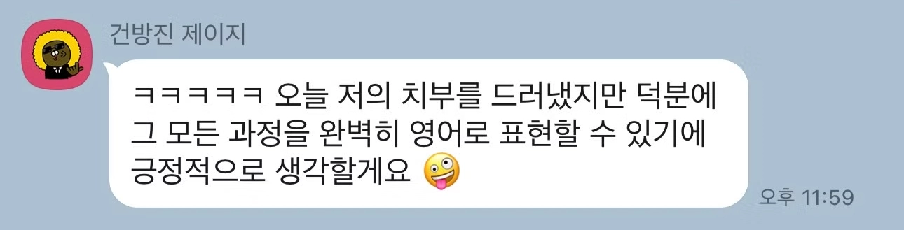 수업 종료 후, 에일린 쌤이 1:1 카톡으로 교정된 문장을 보내드립니다. 이 문장들은 다음 수업까지 반드시 복습하셔야 합니다.